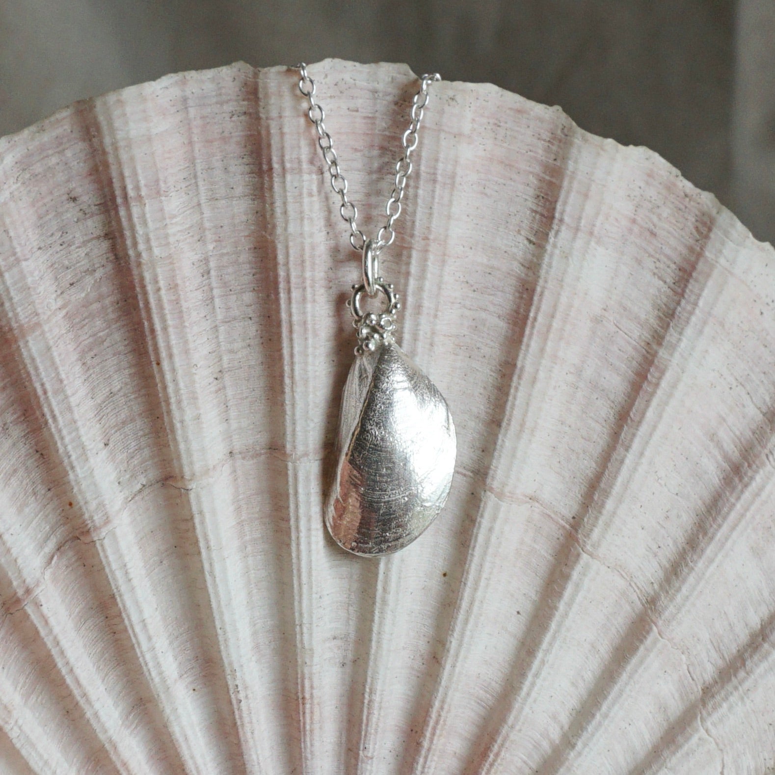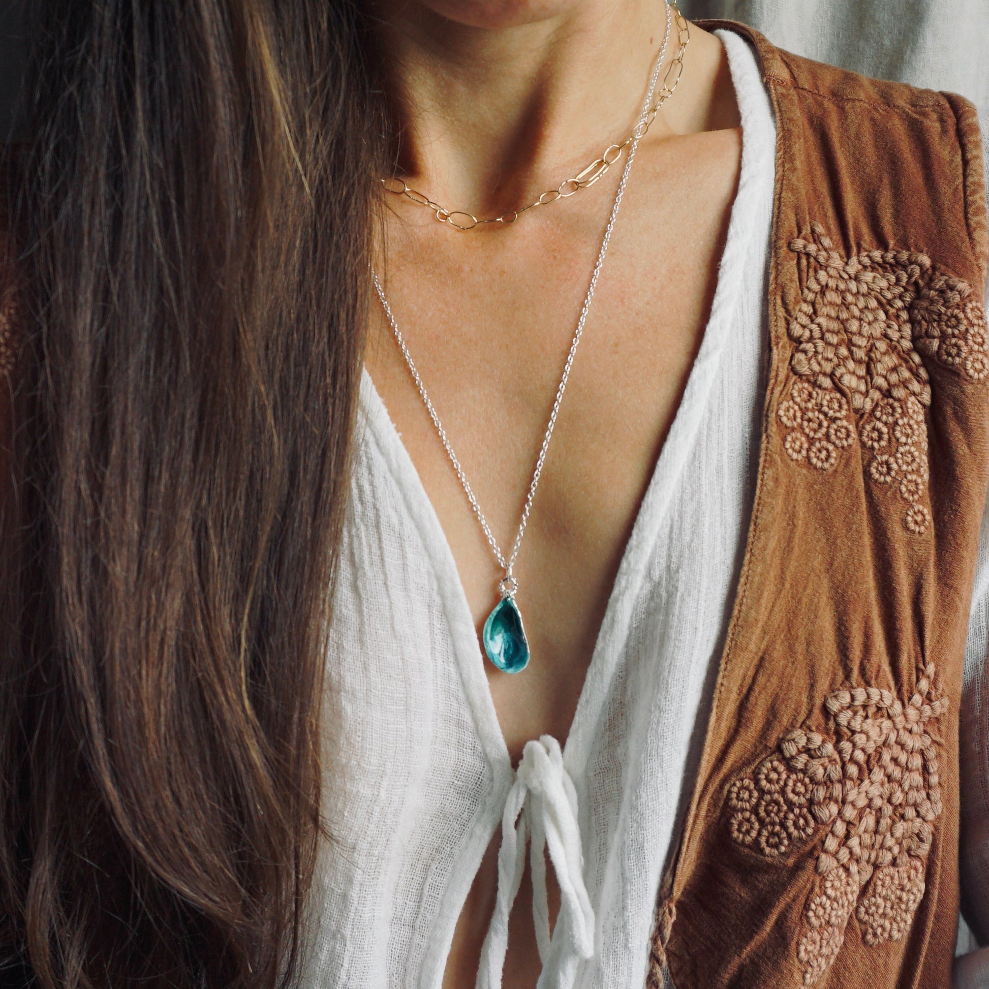 Reversible mussel shell necklace with beautiful ombre teal - blue enamel.