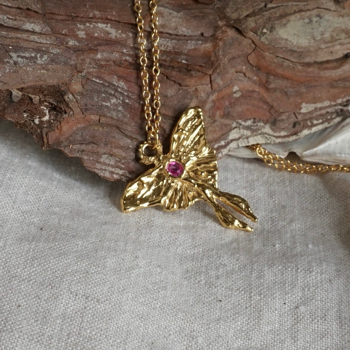 A Luna moth necklace featuring a beautiful ruby in gold vermeil