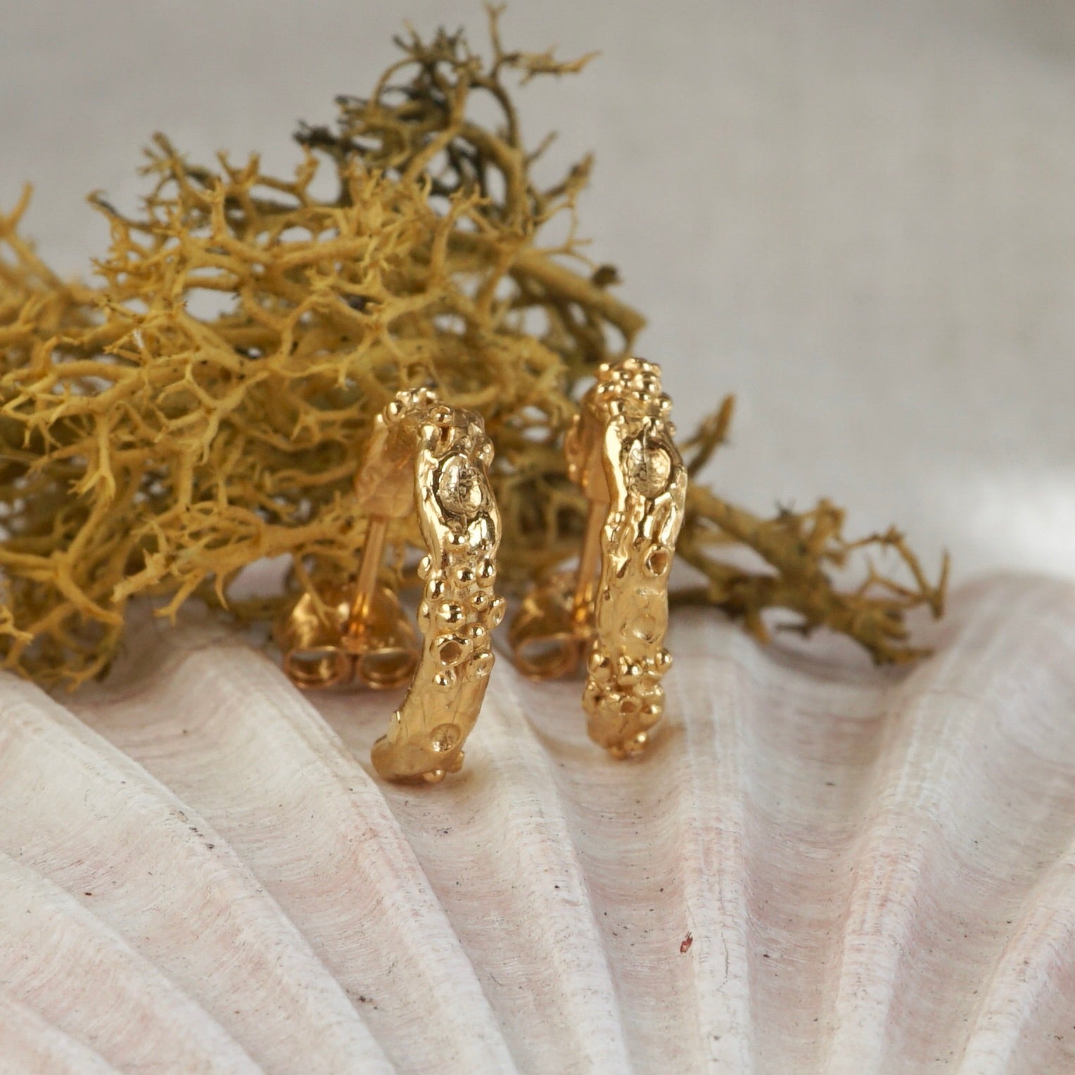 Inspired by mighty ancient oak trees, these hoop earrings feature lichen clusters and twisted, knotty bark details.